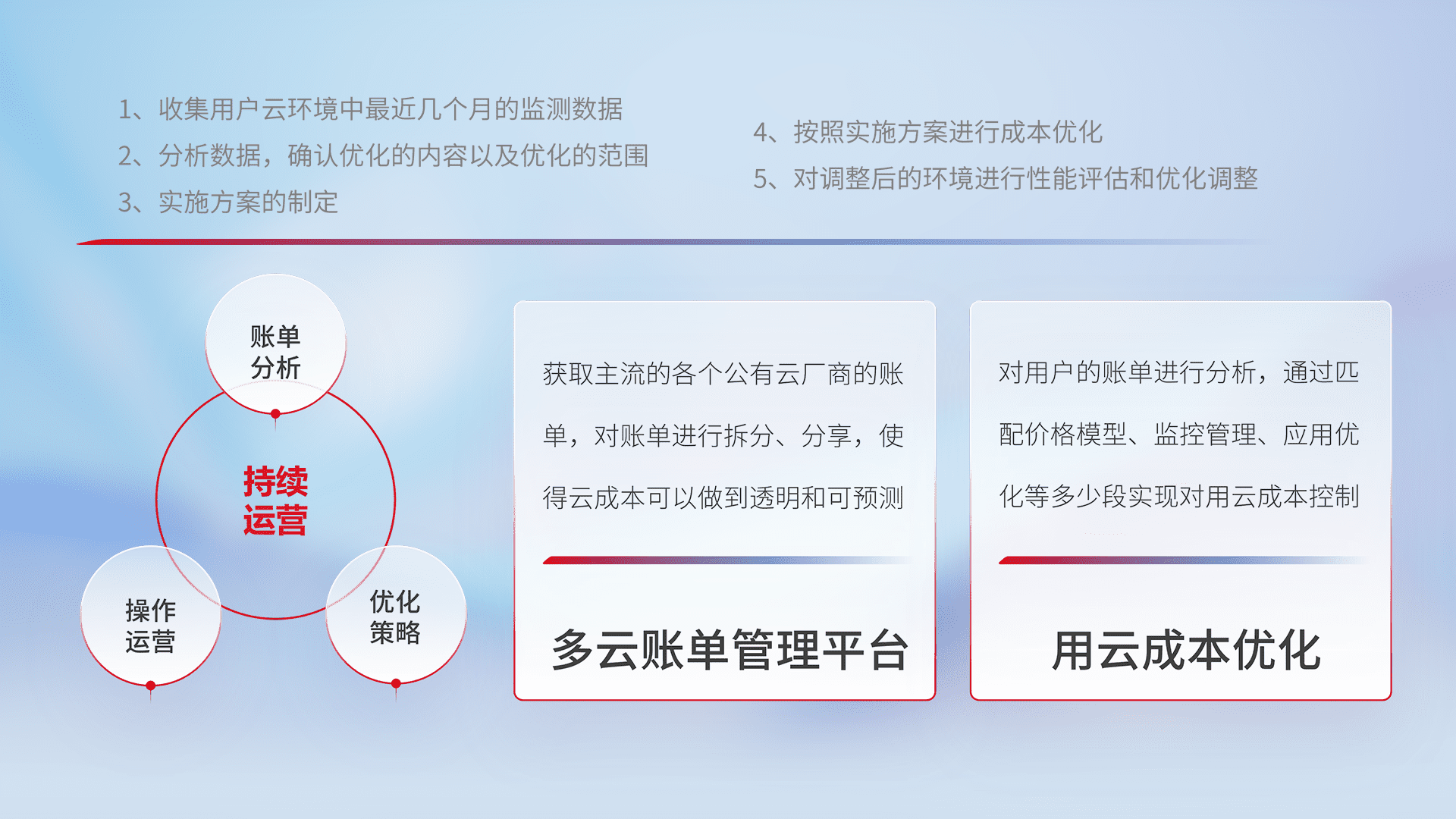 通过多云纳管,,以统一的资源数据模型把客户的云资源进行抽象和封装,,,,进而实现对多云资源的统一操作,,,,保障云资源管理的可靠性、、稳定性与可用性。。量身定制化运维内容,,,,配置、、、、开发运维、、、补丁管理、、、、备份、、、监控、、、认证和访问管理、、、、审计和日常巡检等,,保障在用云过程中的可靠度,,,稳定度以及高可用率。。。。