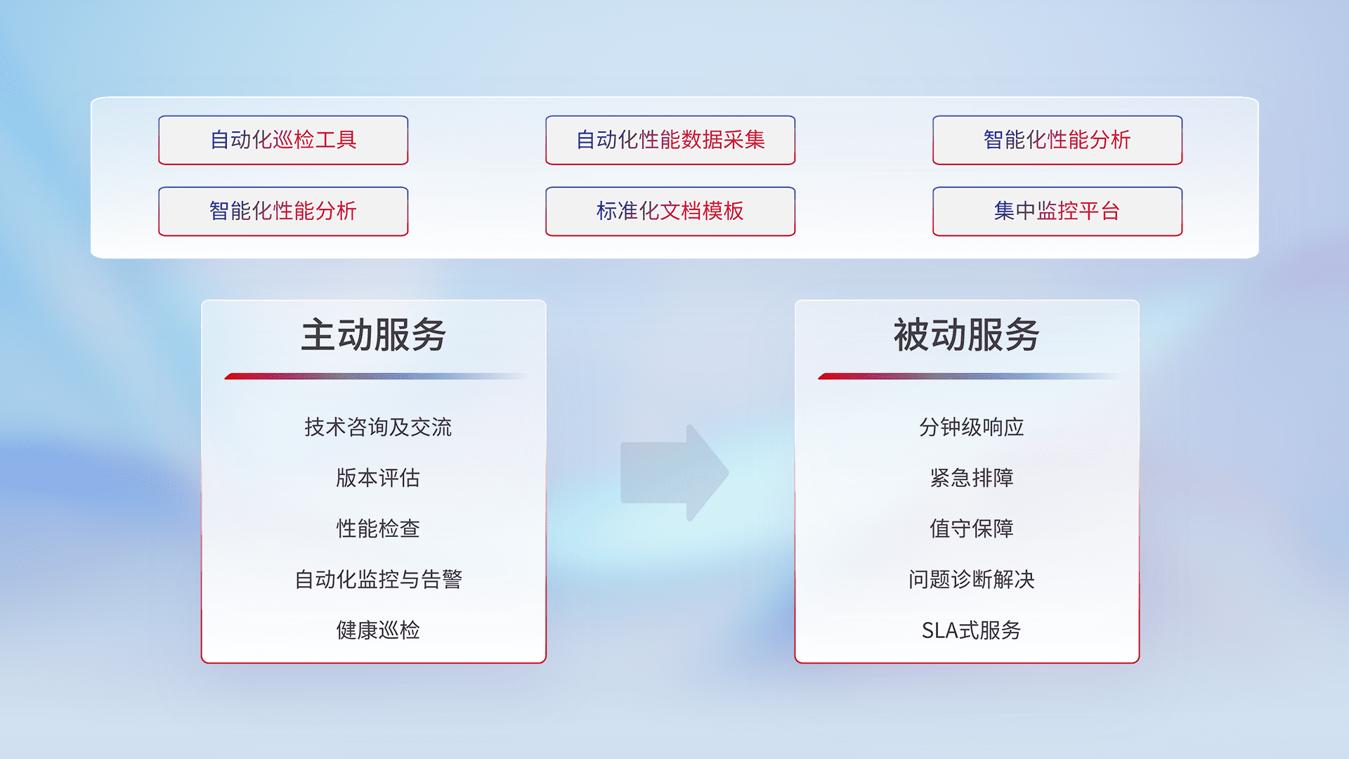 智能化工具和标准化文档,,保障服务质量,,提供主动服务(包含技术咨询、、、版本评估、、、、性能检查、、、自动化监控与告警、、、、健康巡检)和被动服务包含(分钟级响应、、、紧急排障、、、值守保障、、、、问题诊断解决、、、、SLA服务)。。。